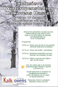 In de donkere Decembermaand heeft Stichting Kalkovens Hasselt een tweetal unieke avonden georganiseerd. Op maandag 15 en dinsdag 16 december zijn de Kalkovens speciaal geopend in de avonduren om zo de mooi uitgelichte kalkovens te bewonderen. Lees verder “Exclusieve Winteropenstelling Kalkovens”
